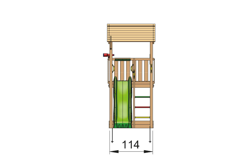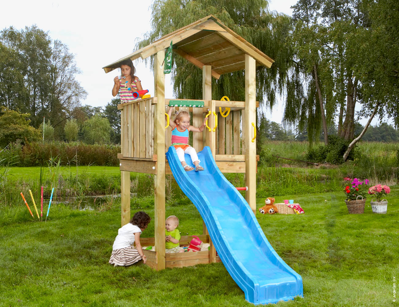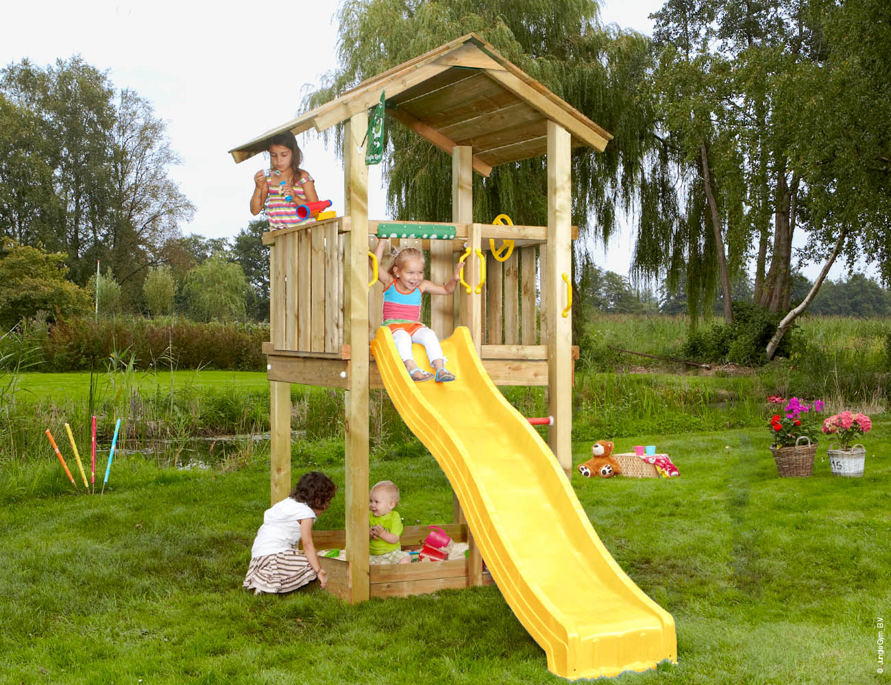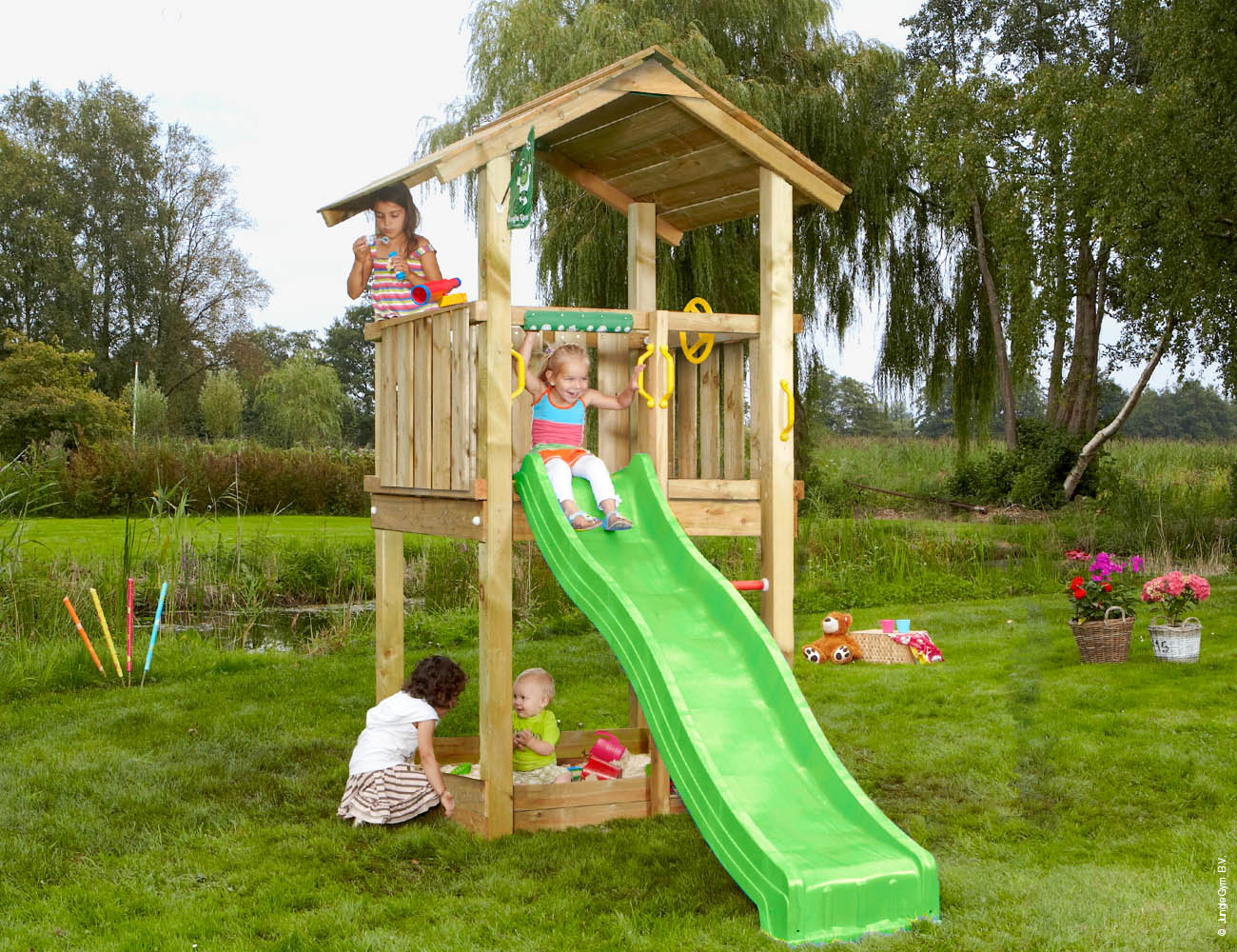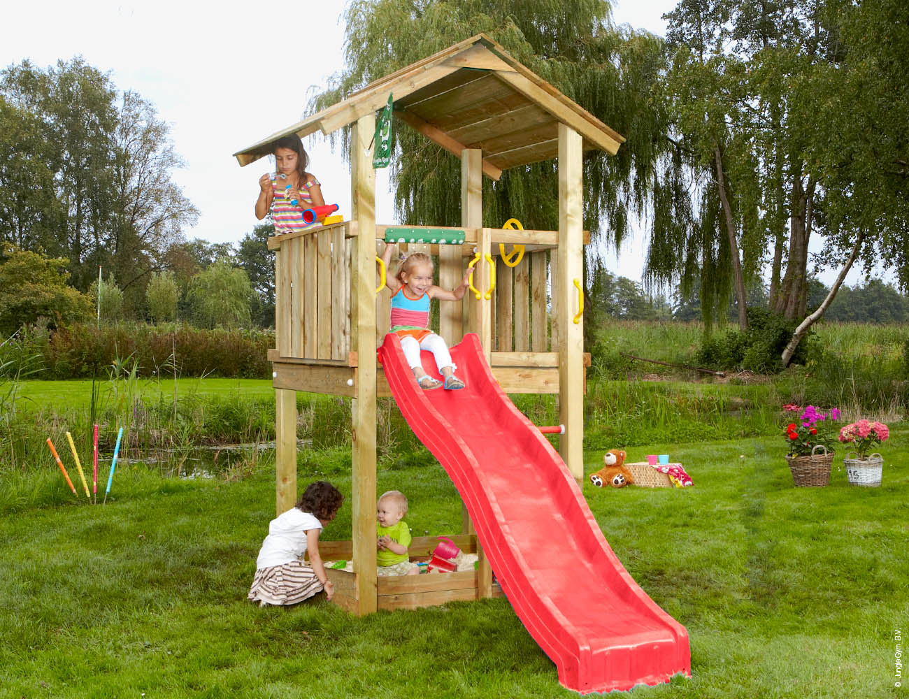 Kisebb kertek ideális játéka. Függőleges létra biztosítja a feljutást a toronyba, a platform alatt homokozó alakítható ki.