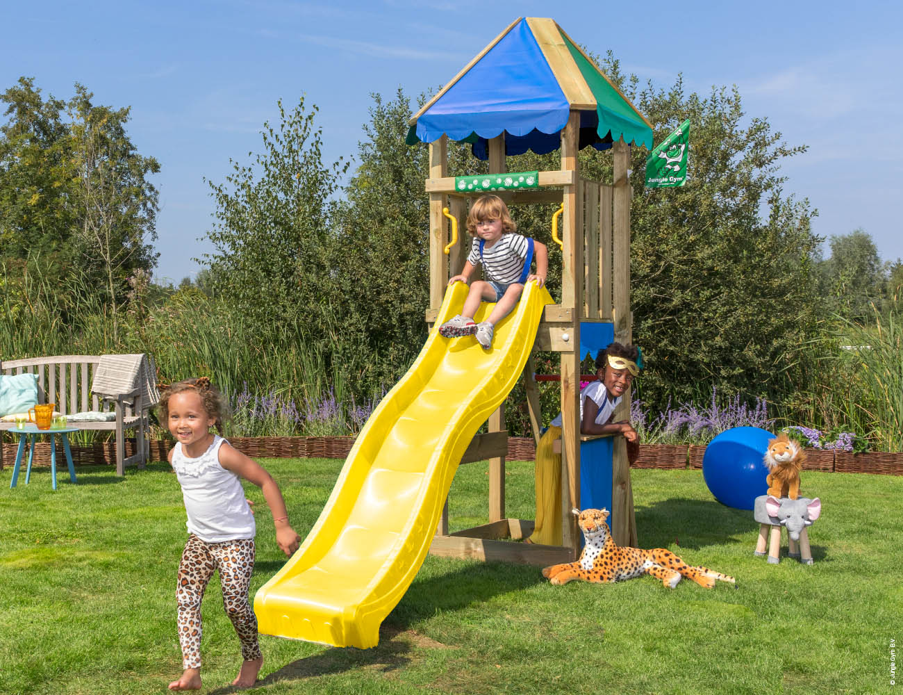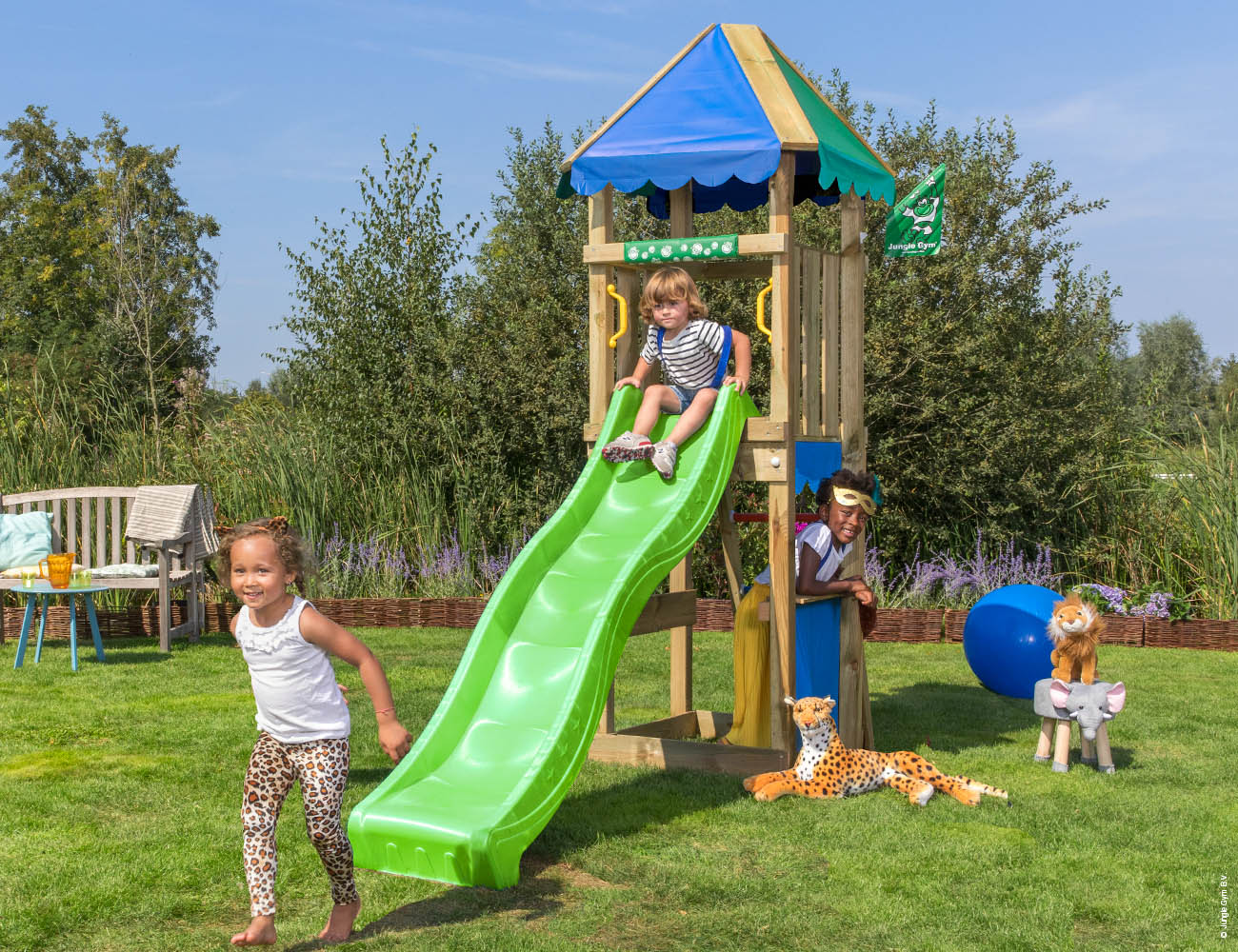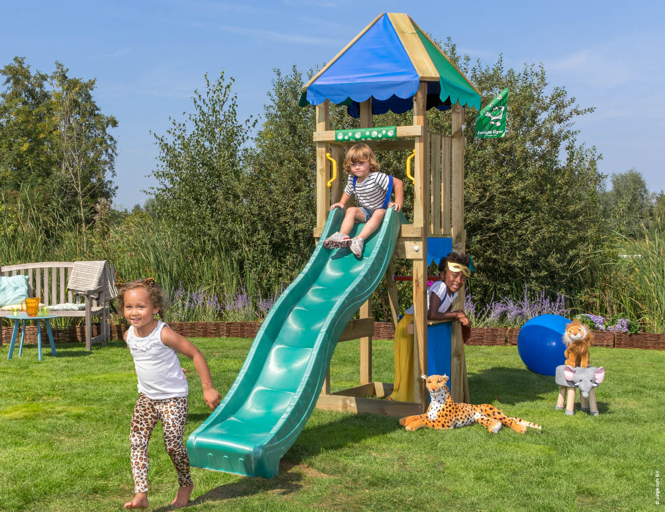 Egyedi megjelenésű játszóház döntött létrával, csúszdával. A torony alja kibolt vagy homokozó is lehet.