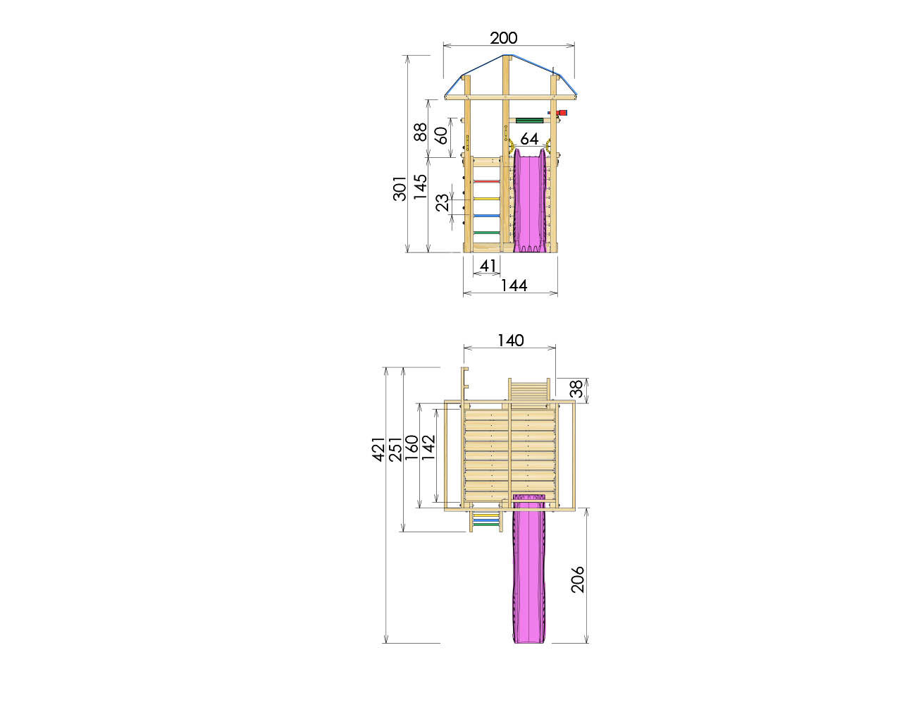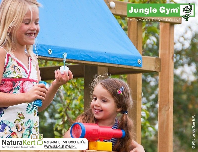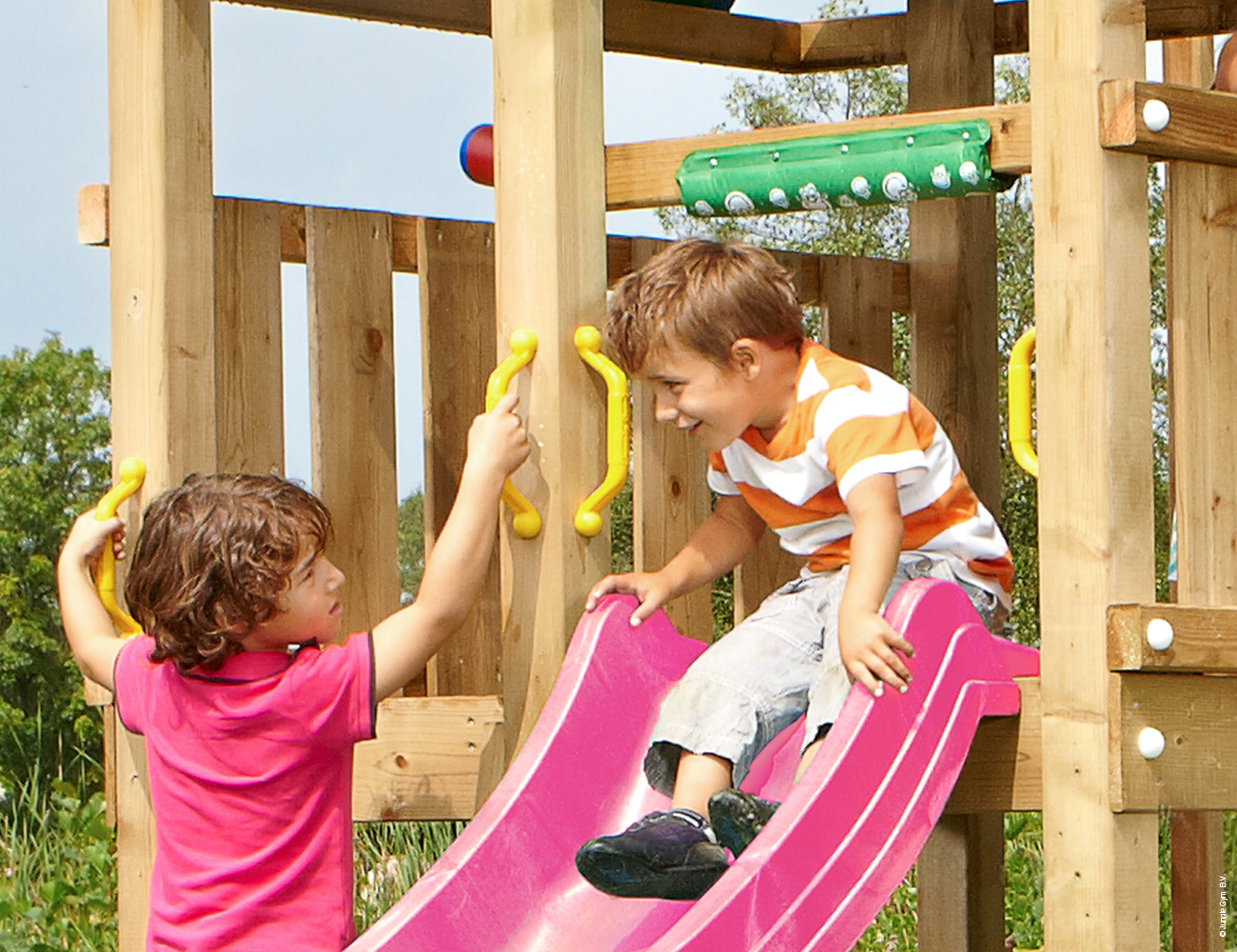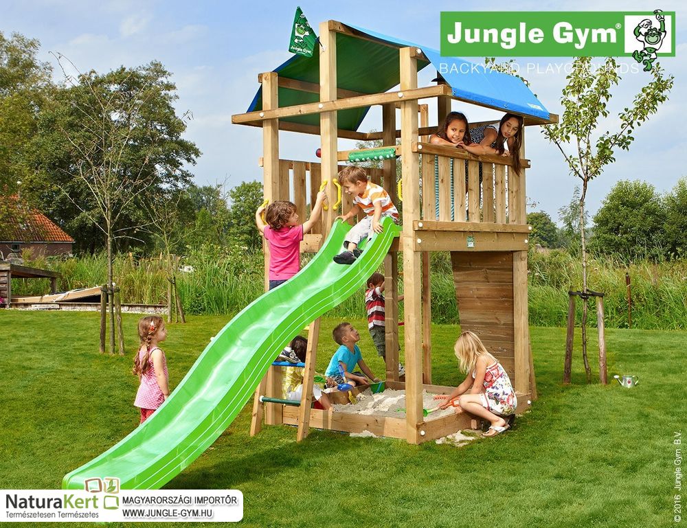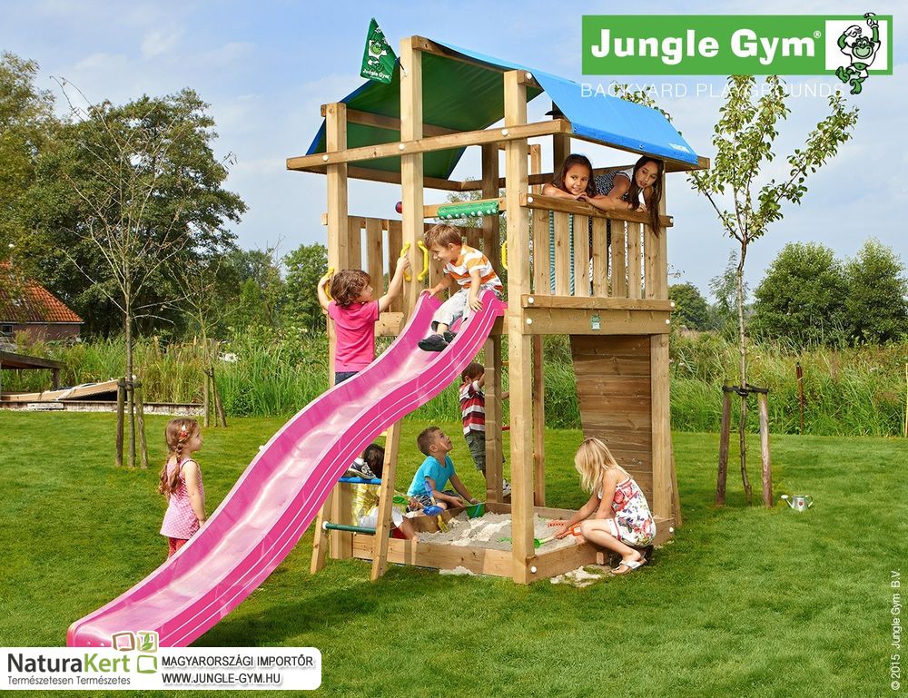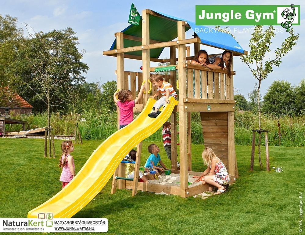 Egy erős és biztonságos torony sok vidám kiegészítővel. A létrán vagy a mászófalon is könnyű feljutni a toronyba, hogy onnan sebesen csúszhassanak is le homokozni a gyerekek.