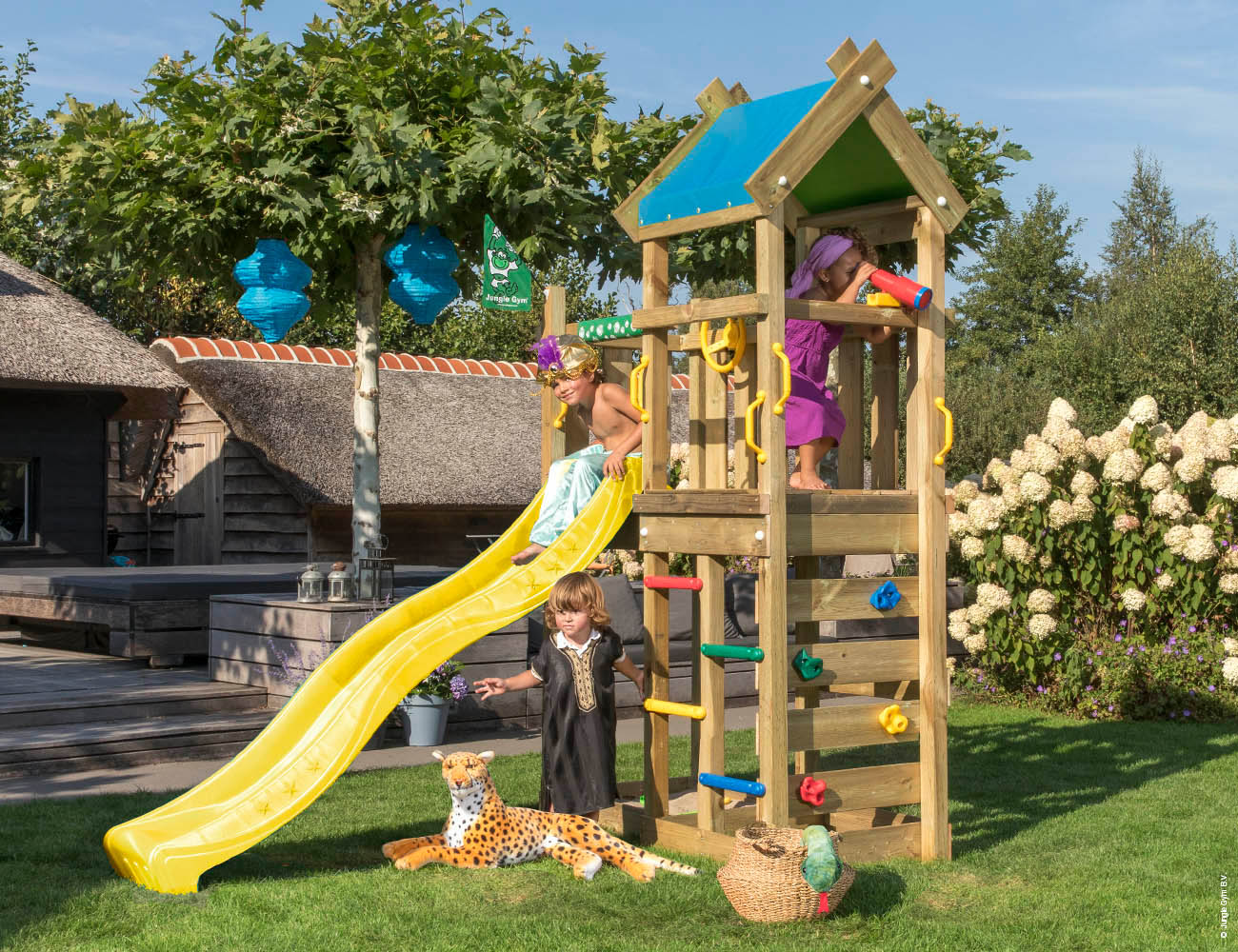 Ponyvatetős torony, létrával, mászófallal és csúszdával. A kormánykerék és a távcső a játék alap tartozéka.
