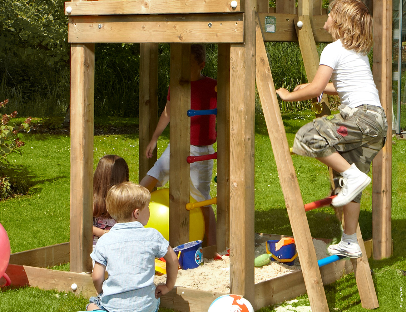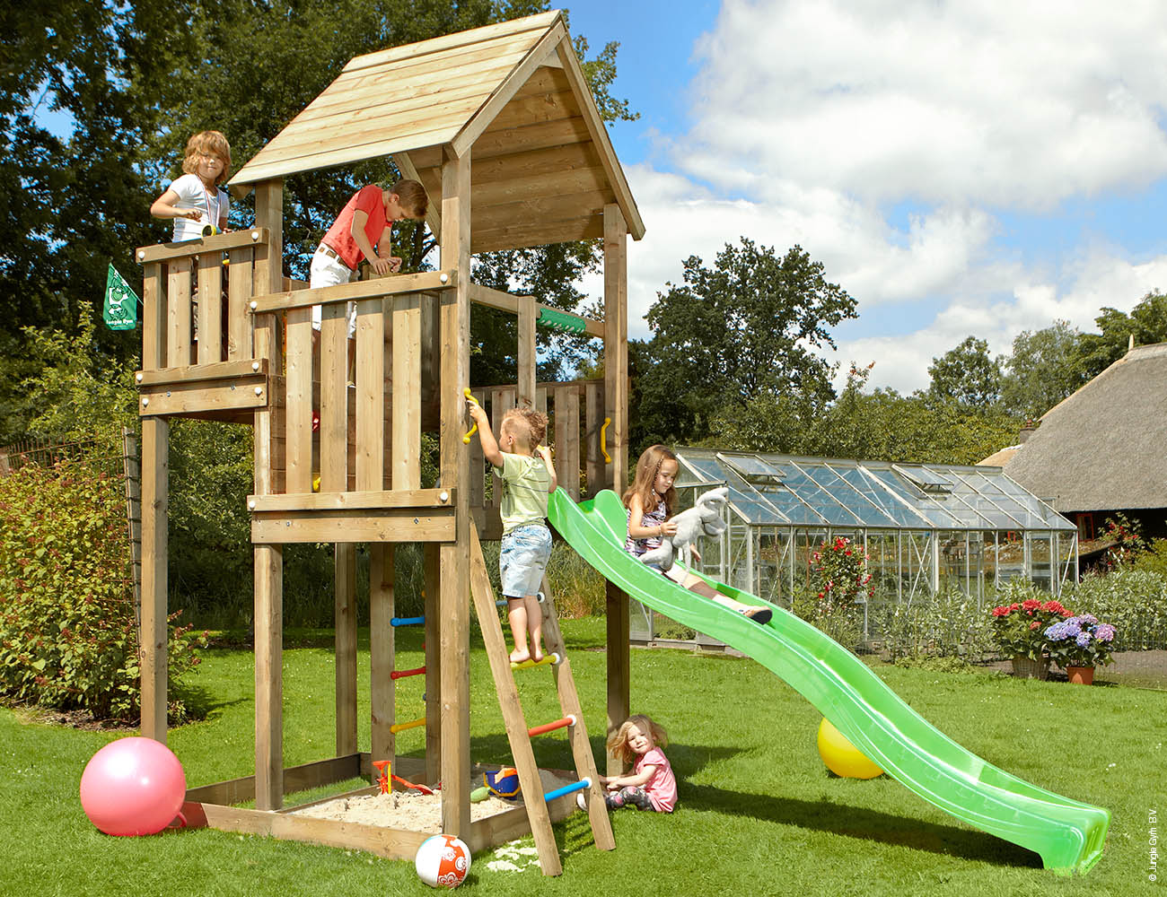 A legnagyobb méretű Jungle Gym kerti fajáték két emelettel, az emeletek között kis mászófallal.