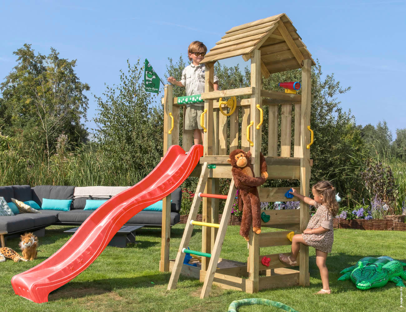 Fatetős torony, döntött létrával, mászófallal és csúszdával. A kormánykerék és a távcső a játék alap tartozéka.